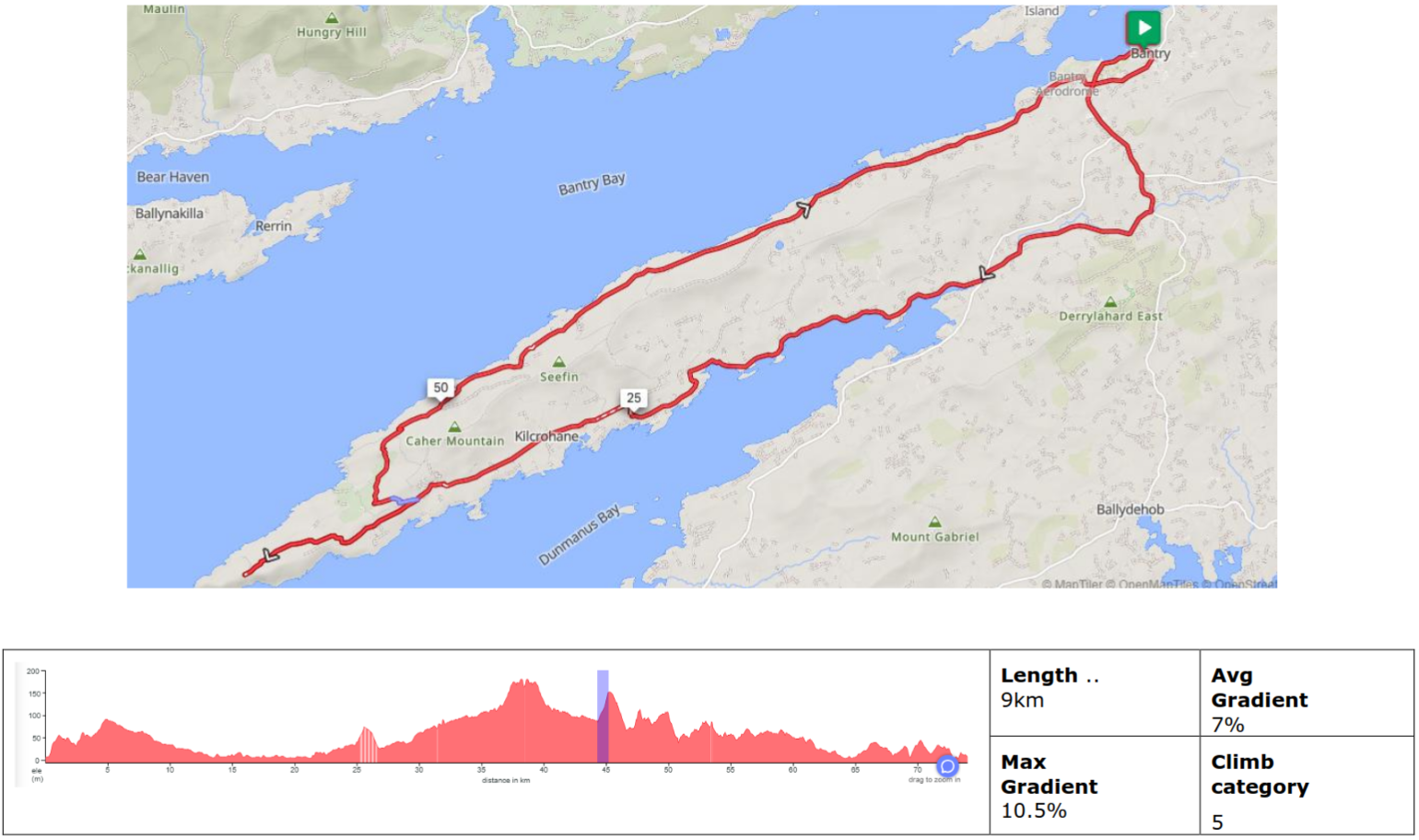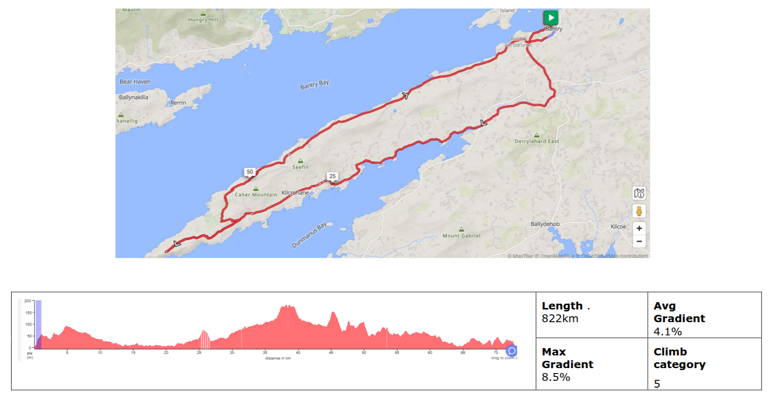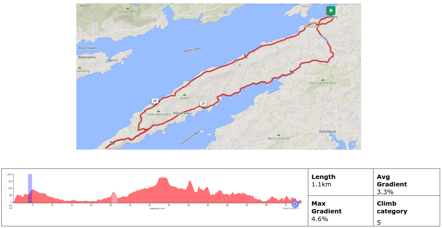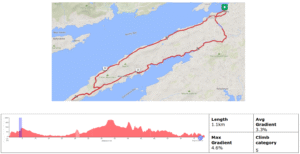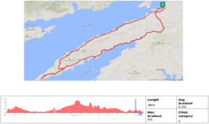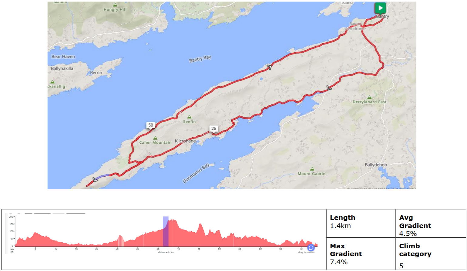 The route is a mixture of public roads, primarily local or regional roads including some National Roads with high traffic volume. Asphalt surface but may have imperfections and potholes than can be avoided. A mixture of steep climbs and descents – with total ascent no greater than 1000m.